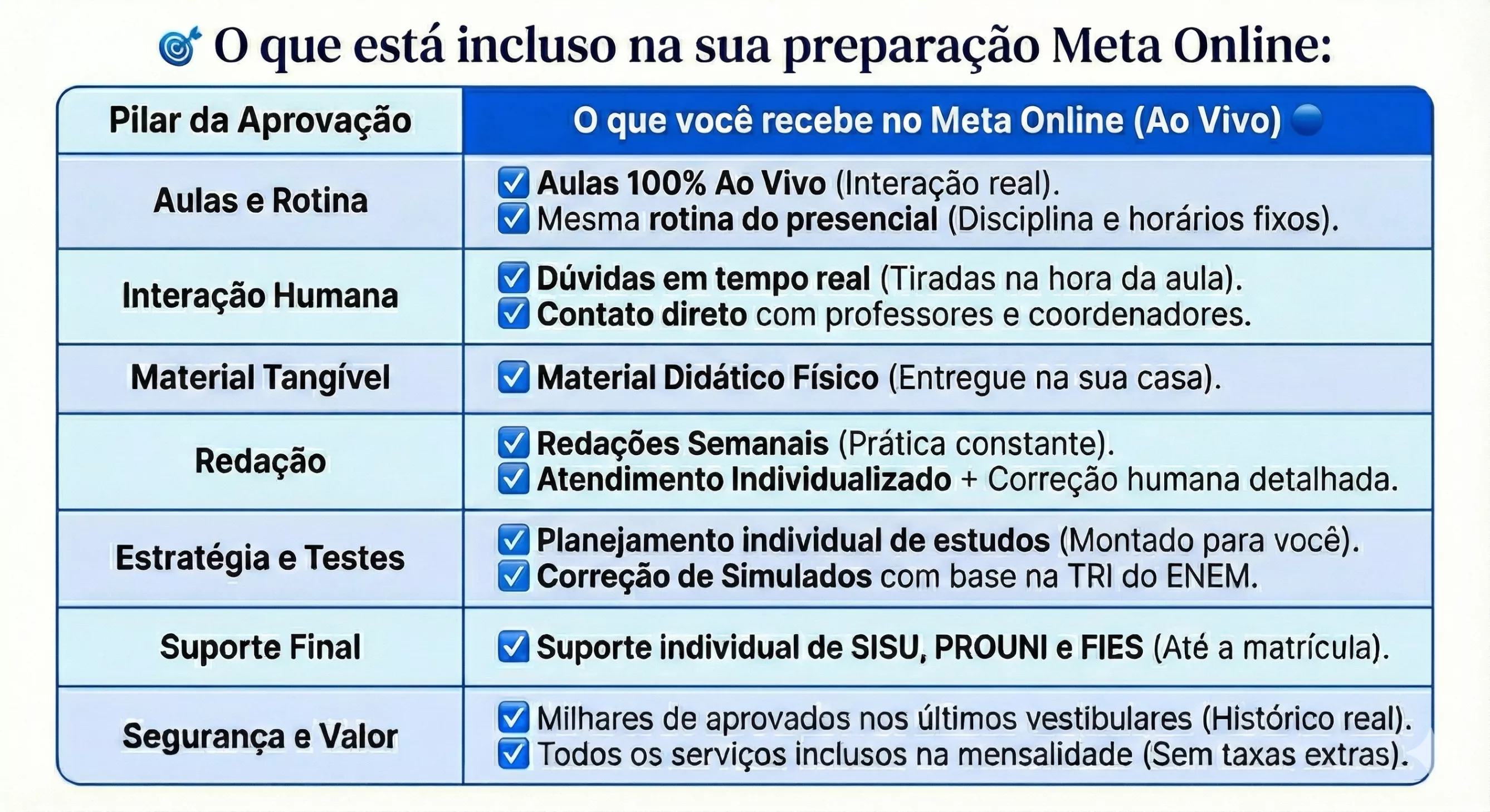 No Meta, o conteúdo deixa de ser bagunçado ou aleatório: nossa metodologia organiza tudo em passos simples e objetivos, facilitando sua compreensão e acelerando sua evolução para o ENEM e os vestibulares — mesmo estudando à distância.